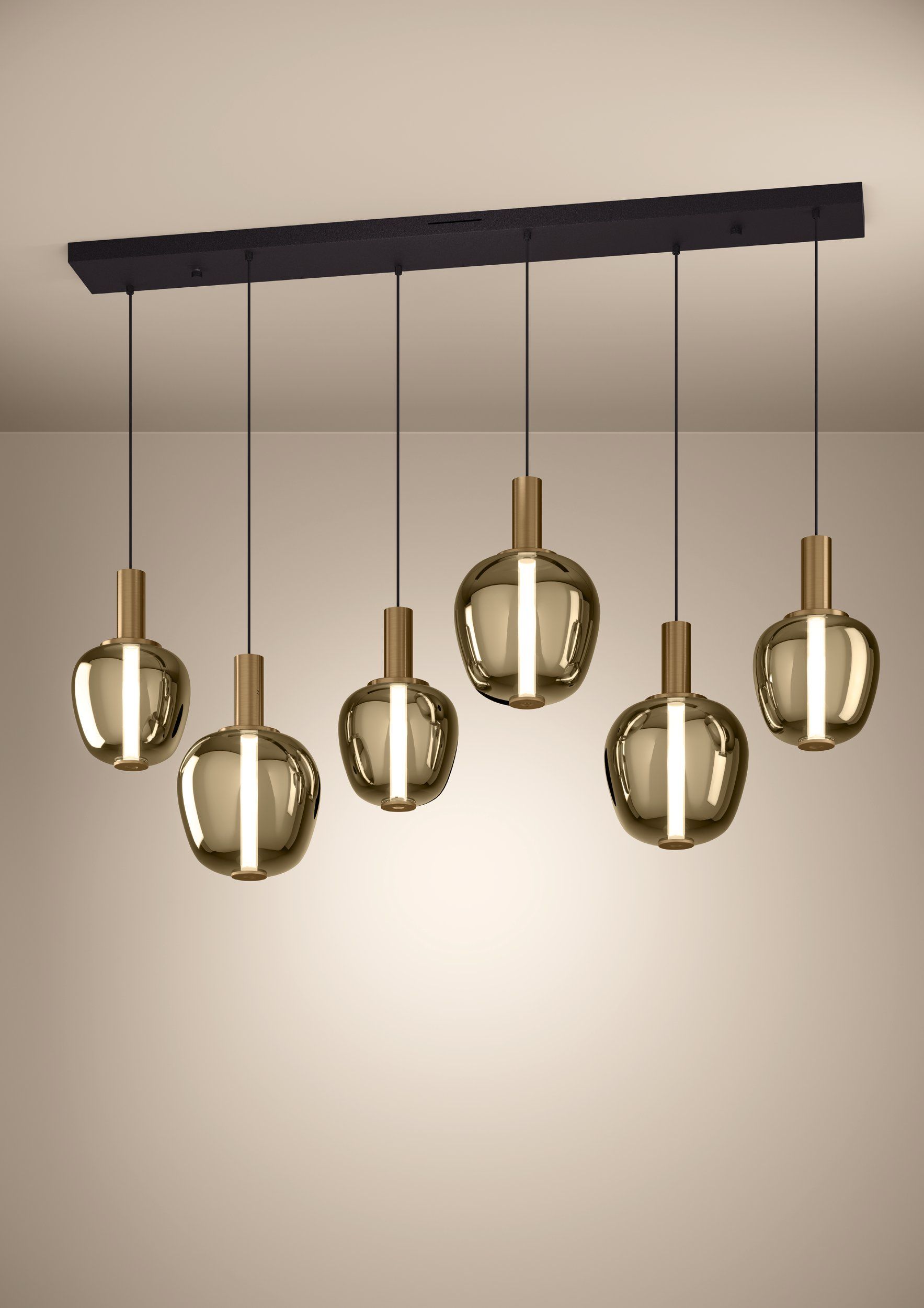 Luster FRUITERA  spaja izražajan dizajn s promišljenom svjetlosnom tehnikom. Šest svjetiljki u karakterističnom obliku zlatne jabuke vise u ravnomjernom rasporedu s uskog, duguljastog baldahina – idealno za stilsko isticanje iznad dugih blagovaonskih stolova, kuhinjskih otoka ili recepcijskih pultova. Igra između mesinganog brušenog čelika i stakla s zlatnim premazom daje svjetiljci toplu, elegantnu pojavu. Unutar svakog staklenog tijela nalazi se svjetlosna cijev s dva izvora svjetlosti: – Jedna cijev kao glavna rasvjeta koja emitira svjetlost u svim smjerovima za ugodnu, mekanu ambijentalnu svjetlost. – Integrirana leća na donjem kraju koja fokusira svjetlo prema dolje – savršena za osvjetljenje stolnih ili radnih površina. Upravljanje svih šest visilica  istovremeno vrši se putem dva beskontaktna senzora ugrađena u jedan od metalnih tubusa: – Prelazak prstom preko jednog senzora: uključuje ili isključuje jedan od dva izvora svjetlosti (cijev ili leća) na svih šest visilica istovremeno. – Držanje ruke iznad senzora: bešumno prigušuje odgovarajući izvor svjetlosti na svim svjetiljkama istovremeno. – Držanje ruke iznad oba senzora istovremeno: aktivira integriranu CCT funkciju koja omogućuje neprekidno podešavanje temperature boje oba izvora svjetlosti od toplo bijele do hladno bijele – za savršenu svjetlosnu atmosferu za svaku priliku. Sa zaštitnim razredom IP20, FRUITERA je prikladna za unutarnju upotrebu i tamo stvara impresivan svjetlosni dojam. Svjetiljka spaja ekskluzivne materijale, estetski dizajn i intuitivnu tehnologiju u efektan element koji dominira prostorom u luksuznim stambenim ili poslovnim prostorima.